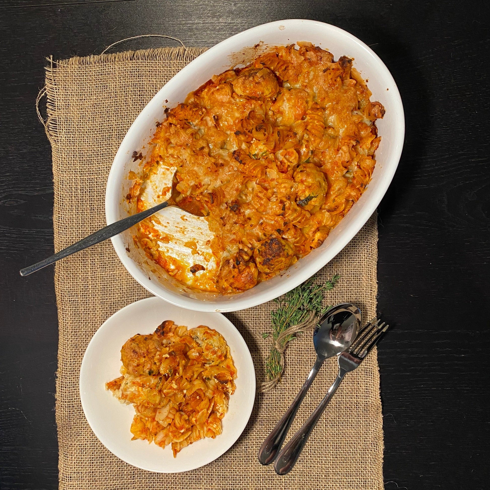 This family serve pasta bake has juicy chicken meatballs, rich nap sauce and tasty cheese.