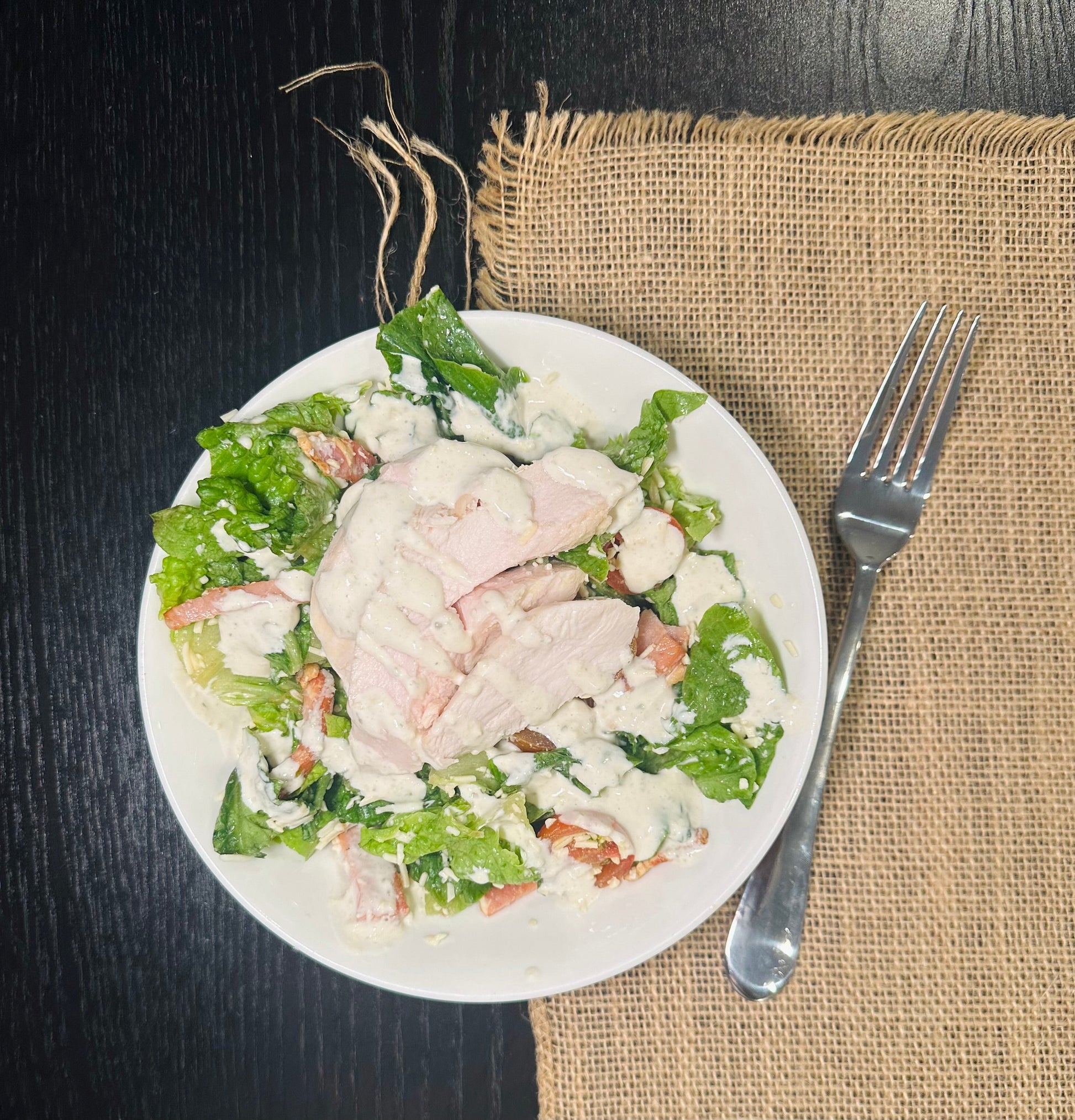 Crumbed gluten free chicken breast, cooked in air fryer, shredded cos lettuce, buttermilk based Caesar dressing, grilled lean bacon and tomato.