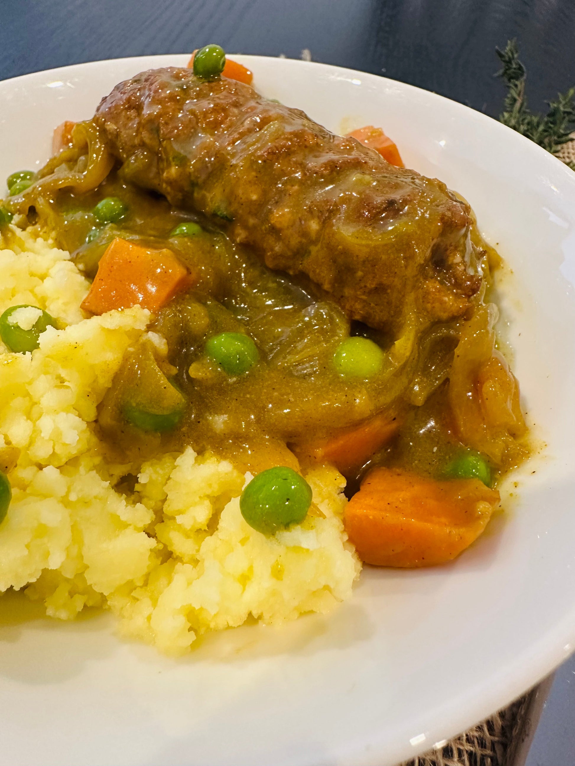 Our handmade beef sausages cooked in a traditional curry sauce with peas and carrots and served with a side of creamy mash.